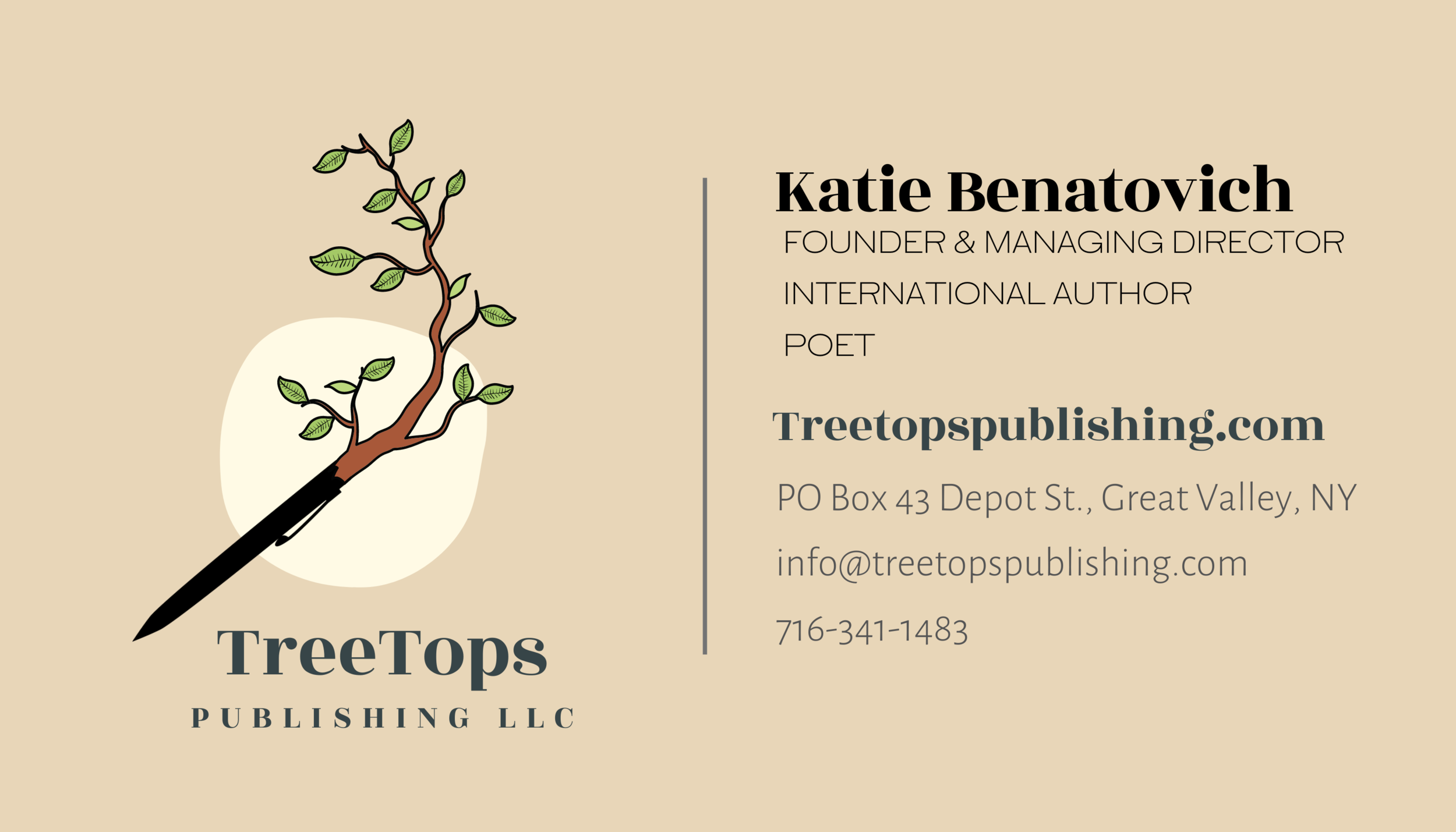 I am Katie Benatovich, Founder of TreeTops Publishing LLC and multilingual book specialist. I focus on assisting in the publication of self-published works. My goal is to support local businesses and creative partnerships that foster community building. TreeTops Publishing LLC makes the best use of online bookstores and marketing tools for the distribution and sales of books and published works.