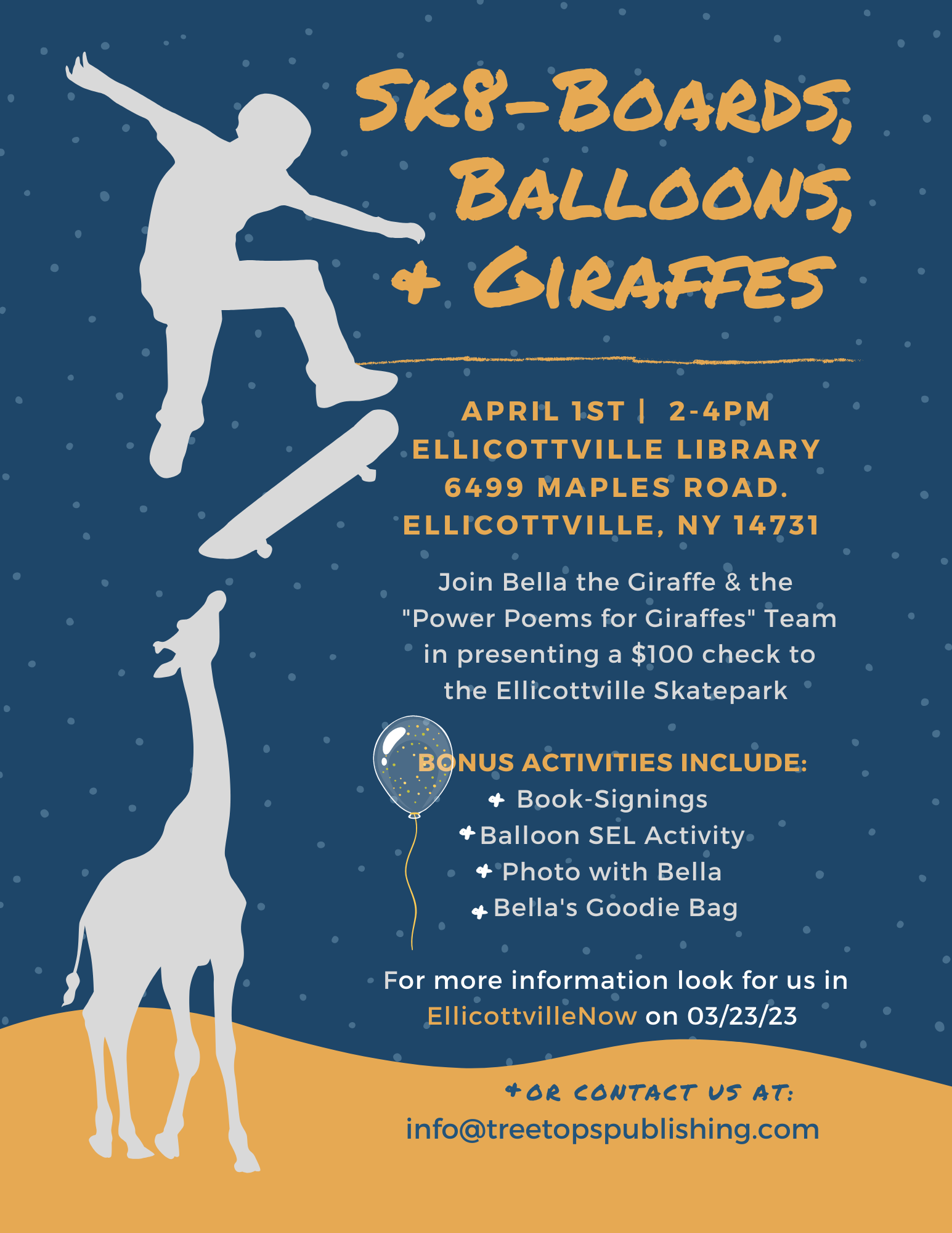 Flyer for the Sk8-Boards, Balloons, and Giraffes Event at the Ellicottville Memorial Library April 1st 2023.