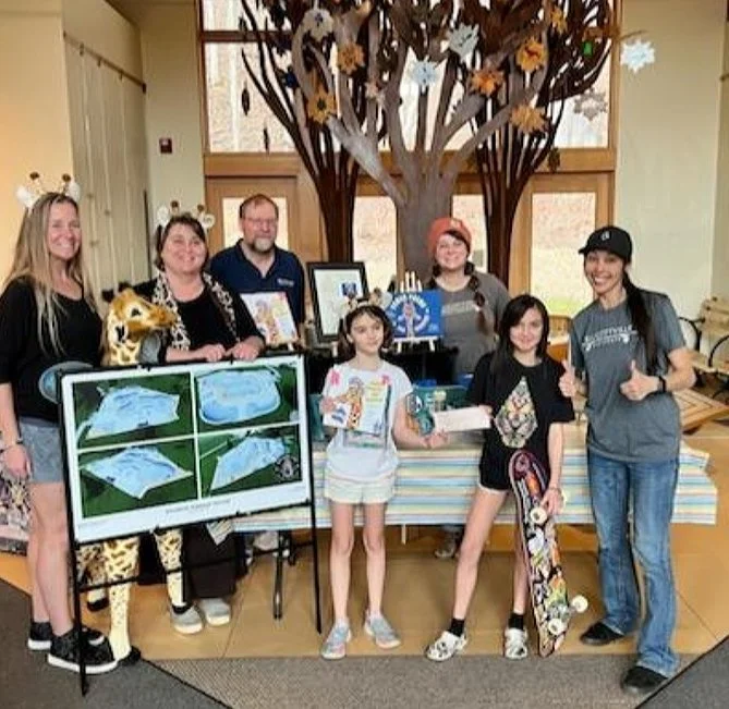 The Giraffe Team presenting Sk8Evl with the donation from the first 100 "Power Poems For Giraffes" books sold at the Sk8-Boards, Balloons, and Giraffes Event.